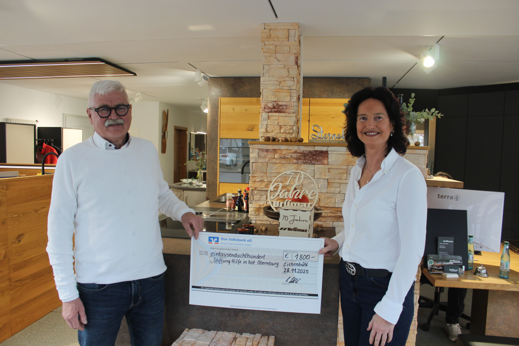 Beim 70-jährigen Firmenjubiläum im November 2025 hat die Firma Brümat Küchenmanufaktur eine Spendenaktion zu Gunsten der Stiftung Hilfe Not initiiert. Die Inhaberin Heike Wild hat ihre Gäste, Unterstützer und Mitarbeiter gebeten, für jedes Getränk oder jede Speise, einen Euro oder auch einen höheren Betrag an die Stiftung Hilfe in Not zu spenden.